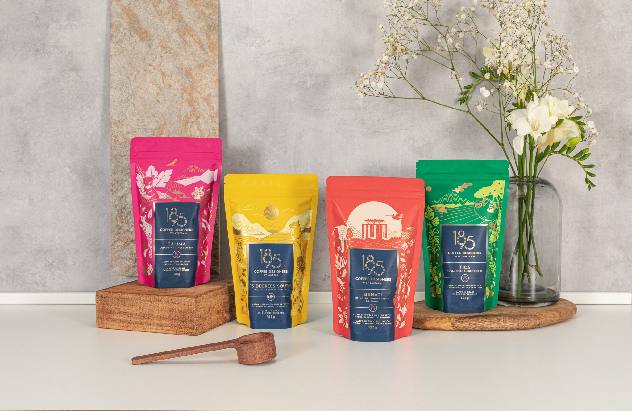 1895 by Lavazza is a premium small-batch coffee bean line that represents the pinnacle of Italian artisan coffee. This single-origin collection draws inspiration from the unique ecology of each coffee's country of origin, featuring refined illustrations of regional flora and fauna. Flavor notes are subtly integrated into the designs, all executed in a geometric yet fluid illustration style that harmonizes with the 1895 logo and brand aroma pattern.